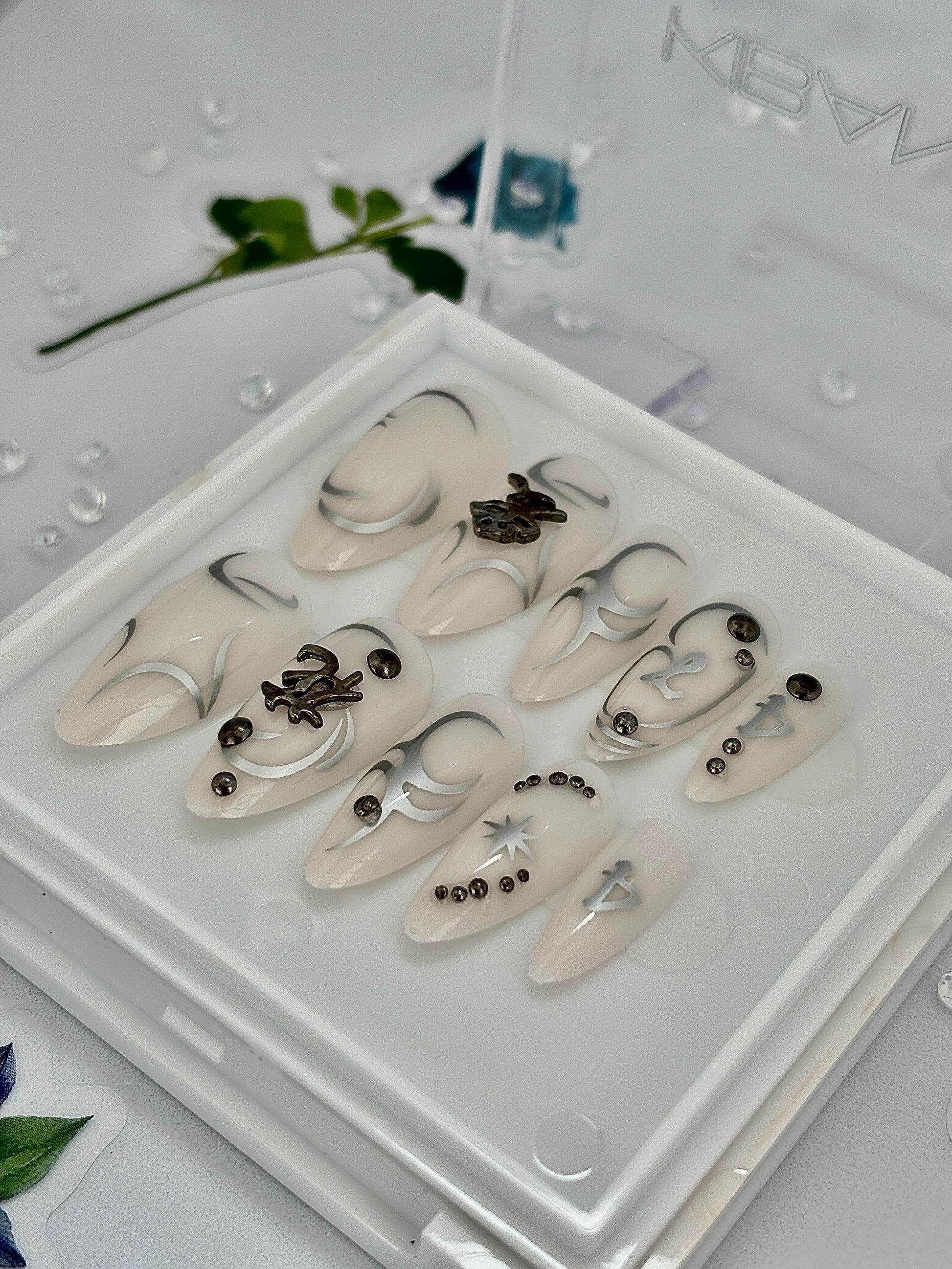 Verziert mit chinesischen Zeichen als 3D-Motive sind diese Chrome-Nägel perfekt, um aufzufallen!