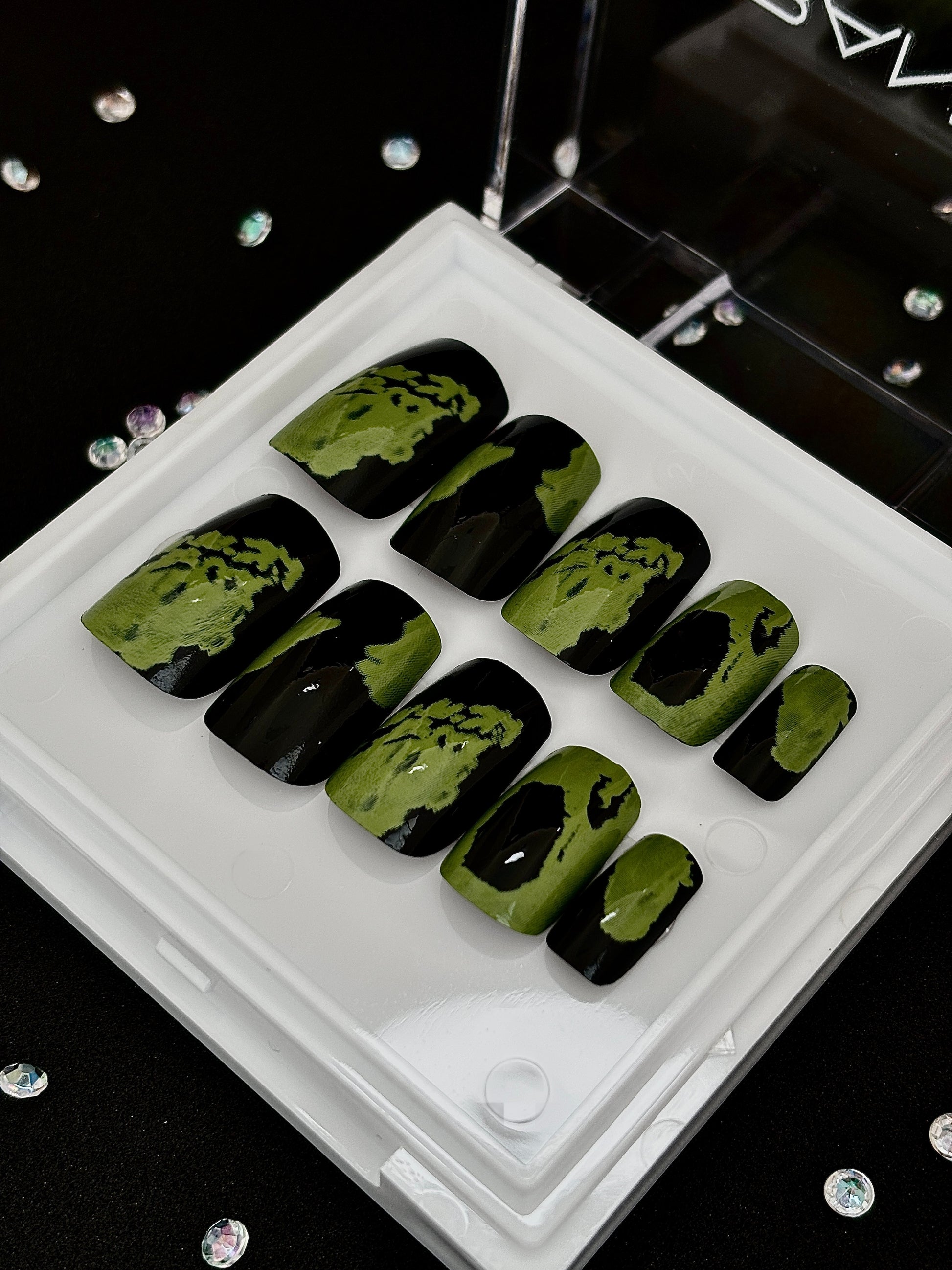Die grün-schwarz verzierten Ballerina shaped Nägel, inspiriert von Shego aus Kim Possible, lassen einen nostalgisch werden... Und sind zufällig ein tolles Design für Halloween!